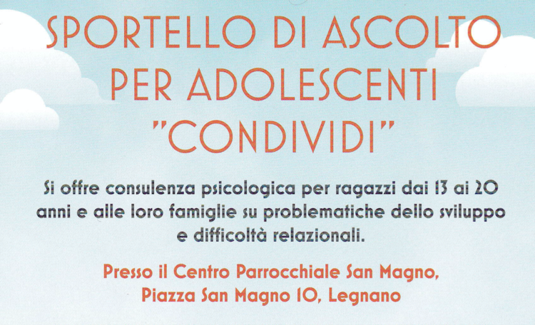 "Condividi" è il nostro sportello d'ascolto, rivolto a ragazzi dai 13 ai 20 anni e ai loro genitori, pensato per fornire un luogo di riflessione e di confronto che aiuti ad affrontare le difficoltà che si incontrano normalmente in fase di crescita, ma anche problematiche specifiche quali: