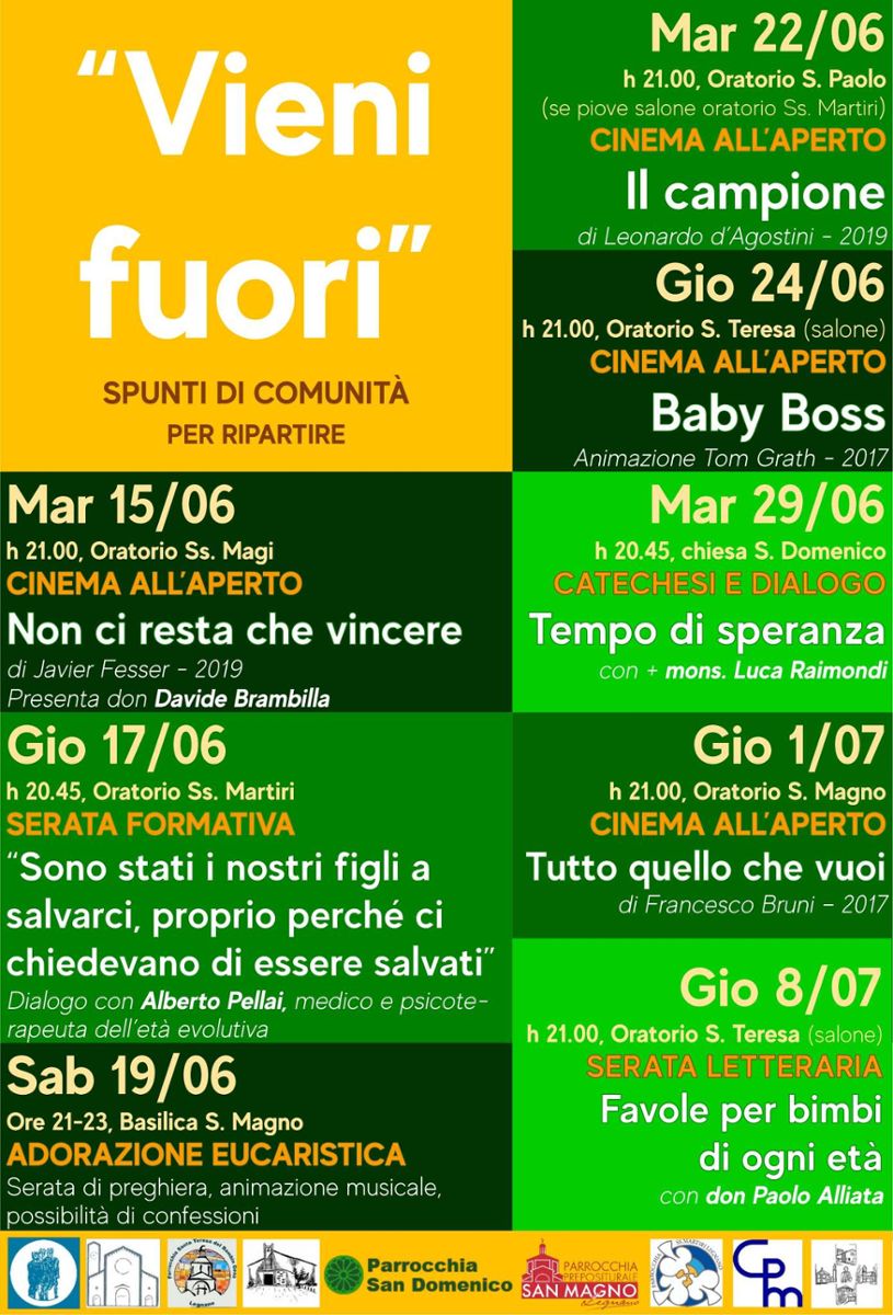Le parrocchie della città di Legnano propongono una serie di serate intitolata “Vieni fuori – Spunti di comunità per ripartire”. Le proposte spaziano dal cinema, alla preghiera, alle serate formative su diversi argomenti.