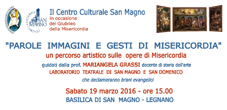 Il Centro Culturale San Magno e la Parrocchia di San Magno, in occasione del Giubileo della Misericordia, invita ad un percorso artistico sulle opere di Misericordia “Parole, Immagini e Gesti di Misericordia” guidati dalla professoressa Mariangela Grassi, docente di storia dell’arte che illustrerà significative opere d’arte e vite di alcuni Santi, e da attori del Laboratorio Teatrale di San Magno e San Domenico che declameranno brani evangelici.