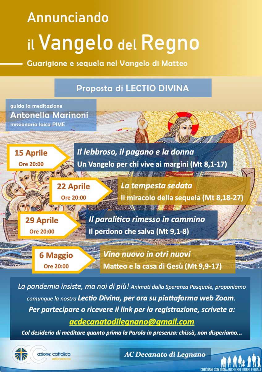 Pur nelle difficoltà di queste settimane, l'Azione Cattolica decanale propone la Lectio Divina, appuntamento consueto da tempo, quest'anno sulla traccia evangelica di Matteo. Con una formulazione online: quattro appuntamenti, scanditi da passi evangelici, ci accompagna nella meditazione Antonella Marinoni, missionaria laica PIME.