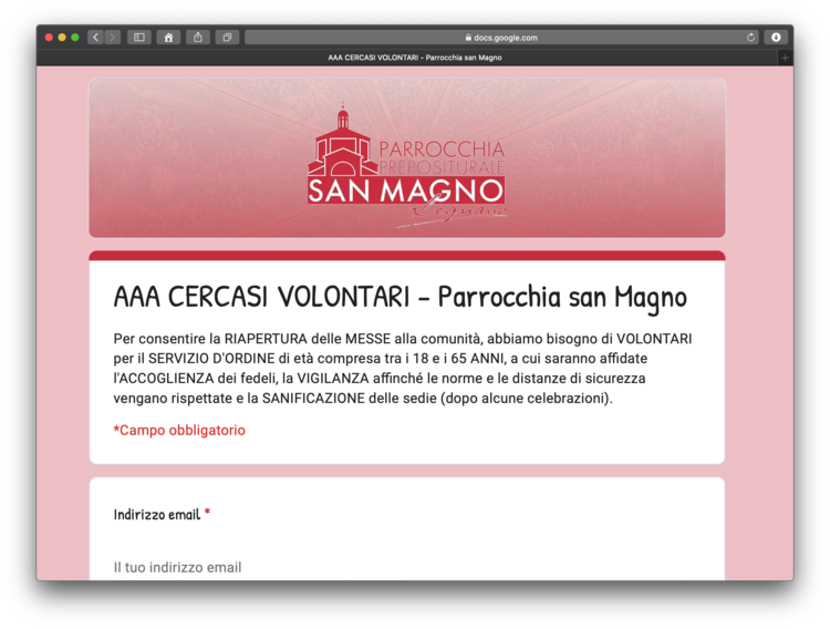 Per poter garantire una sicurezza per tutti i fedeli nella riapertura delle Sante Messe alla comunità abbiamo bisogno di volontari per il servizio d’ordine. Ecco il QUESTIONARIO da compilare per tutti i volontari